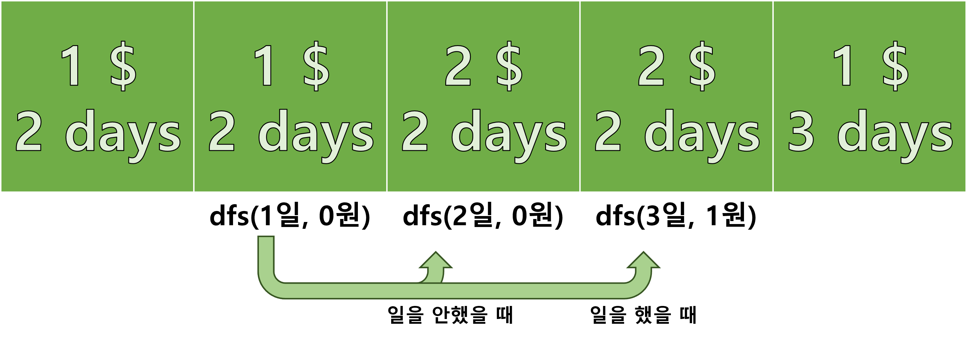 해당 분기를 어떻게 나눌 수 있을까요? 우리는 첫번째 날에 주어진 일을 할 때와 하지 않을 때로 나누어서 다음 재귀로 돌입할 수 있을 겁니다. 1원의 수익을 주는 이틀짜리 일이므로 일을 했을 때는 2일과 1원을 인자로 가진 재귀로, 일을 하지 않았을 때는 1일과 0원을 인자로 가진 재귀로 돌입해주시면 되겠습니다.