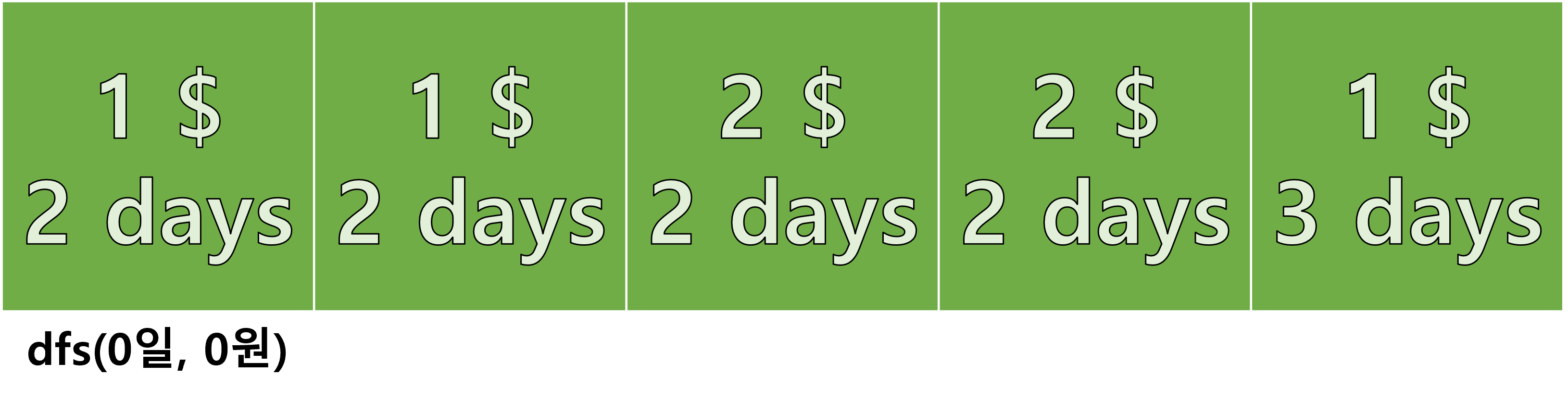 dfs를 구현하였으니 다음은 1일 0원의 차례겠죠! 여기서도 마찬가지로 2일과 1원의 일이 배정되어있는데요, 이 일을 하지 않는다면 수익이 그대로인 채로 다음날(2일)에 도달하게 될 것이고, 일을 한다면 일이 끝난 3일째에 1원의 수익을 가진 채로 이동하게 되겠네요.